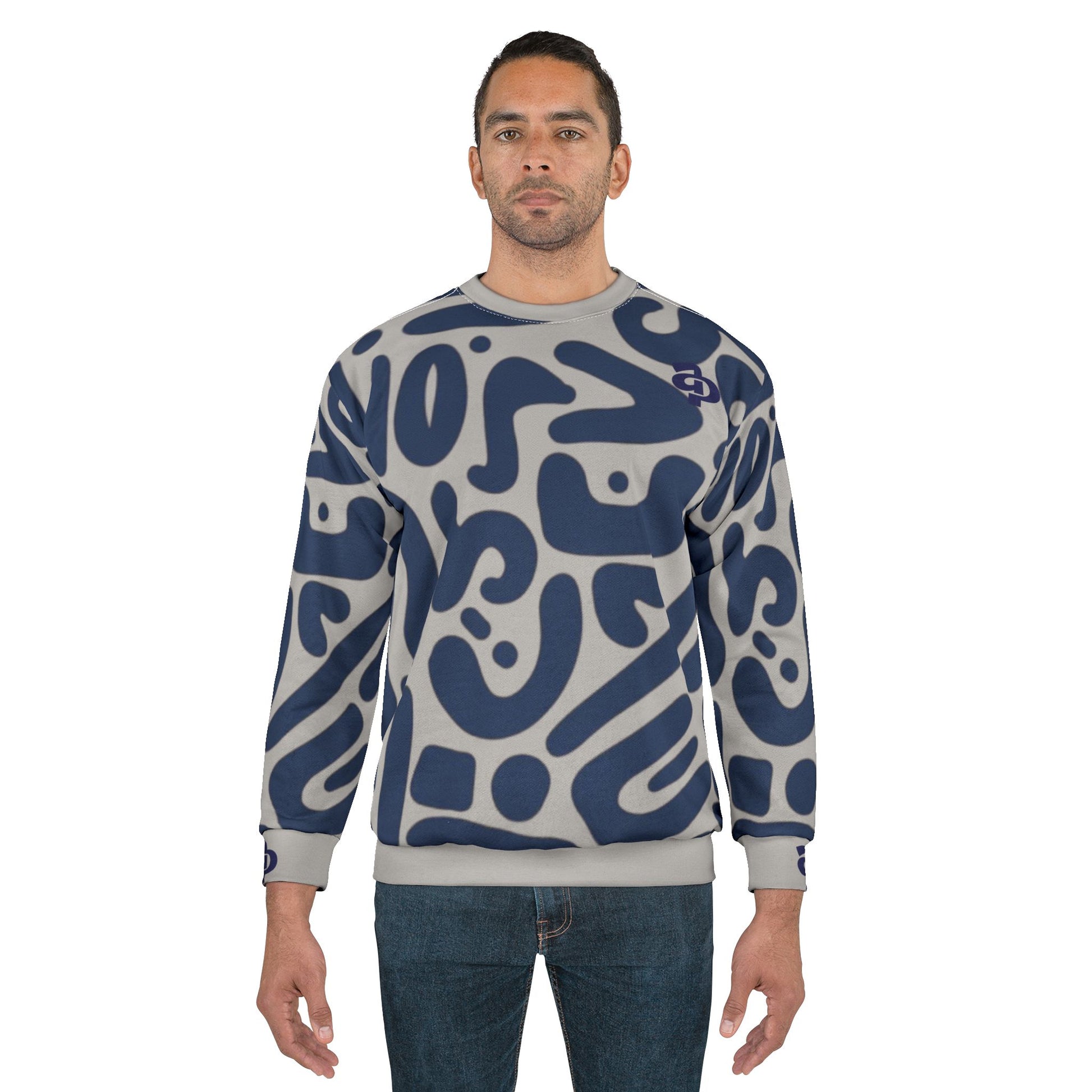 This crewneck sweatshirt brings bold, all-over artistry to everyday wear. The graphic shows organic, abstract shapes in deep indigo against a soft gray field, creating a modern, slightly playful camouflage that reads like wearable graffiti. The medium-weight, 100% polyester fabric keeps the print vivid and the garment shape stable while the 1x1 ribbed collar and cuffs add stretch and structure. Designed and assembled with attention to detail, the custom cut-and-sewn construction lets the pattern flow across seams for a seamless visual impact. It settles into the wardrobe as a statement layer — something to pull on for city strolls, studio sessions, and quiet nights when you want an outfit that feels like an intentional choice rather than background noise.